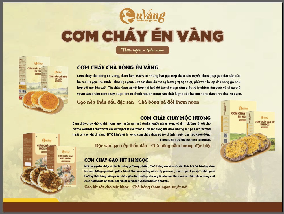Bắt nguồn từ những “hạt ngọc” ấy, bằng bàn tay, khối óc của những con người tận tụy, HTX Bản Việt đã cho ra mắt sản phẩm “Cơm cháy Gạo lứt Én Ngọc” thông qua một dây chuyền sản xuất khép kín, đảm bảo vệ sinh an toàn thực phẩm. Miếng cơm cháy có vị ngọt bùi của hạt gạo làng, độ giản rụm của lớp vỏ cơm ngậy mà không ngấy.