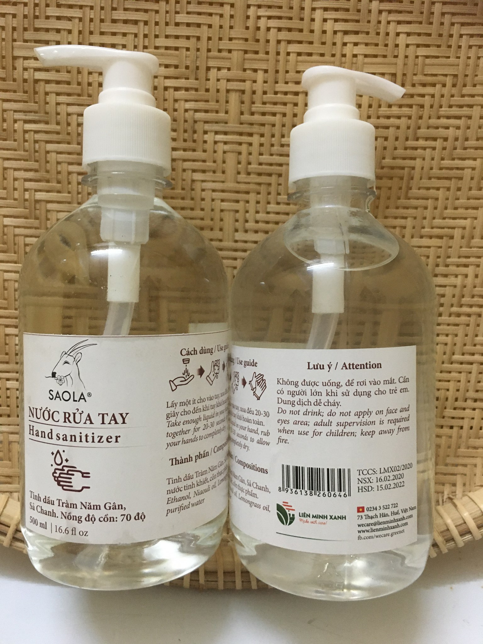 Nước Rửa Tay Sao La 500ml. Hàng đầy đủ giấy tờ đảm bảo nguồn gốc rõ ràng. - Sạch tay, diệt khuẩn, khử mùi, làm mềm da tay do có kết hợp với 2 loại tinh dầu nên sẽ khác biệt với các loại nước rửa tay bằng cồn y tế. Thành phần: cồn 70 độ, tinh dầu tràm Năm gân, tinh dầu Sả chanh. Sản xuất bởi công ty TNHH Liên Minh Xanh.